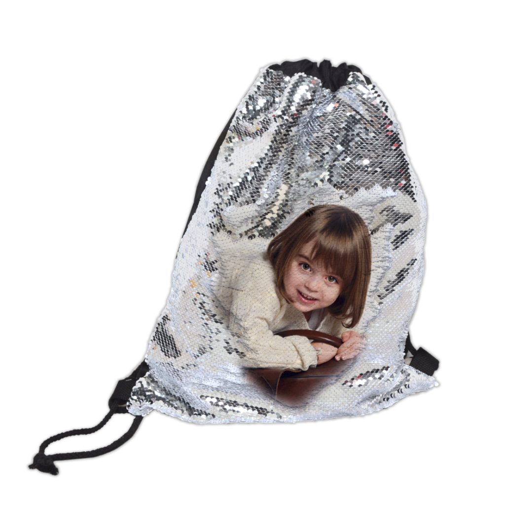 Sacca sport paillettes personalizzabile con foto e scritte.
